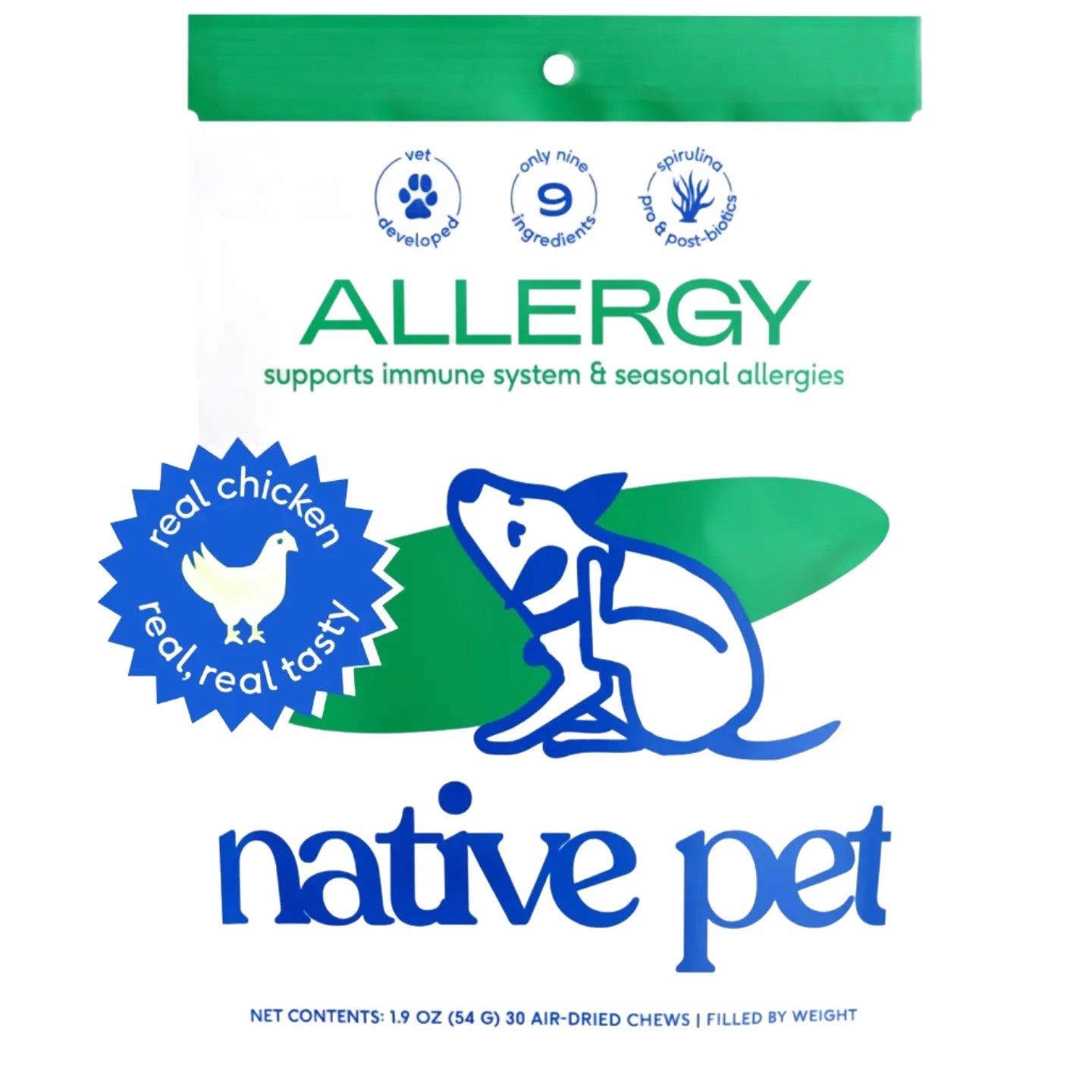 Are seasonal allergies getting the best of your puppy? We have just the thing to help! Not only do these Native Pet Allergy Chews help with the never ending itching, they also support your dog's immune system! These air dried chews have a yummy REAL CHICKEN flavor and are sure to be the best part of your puppy's day!